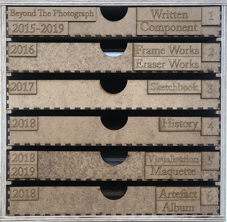 The research output is a unique drawer system – that encompasses the written critical and the visual component of the research journey such as photobooks, visualisation maps and participatory objects.