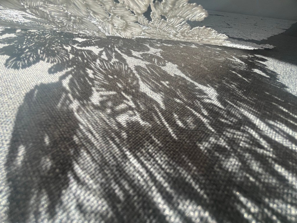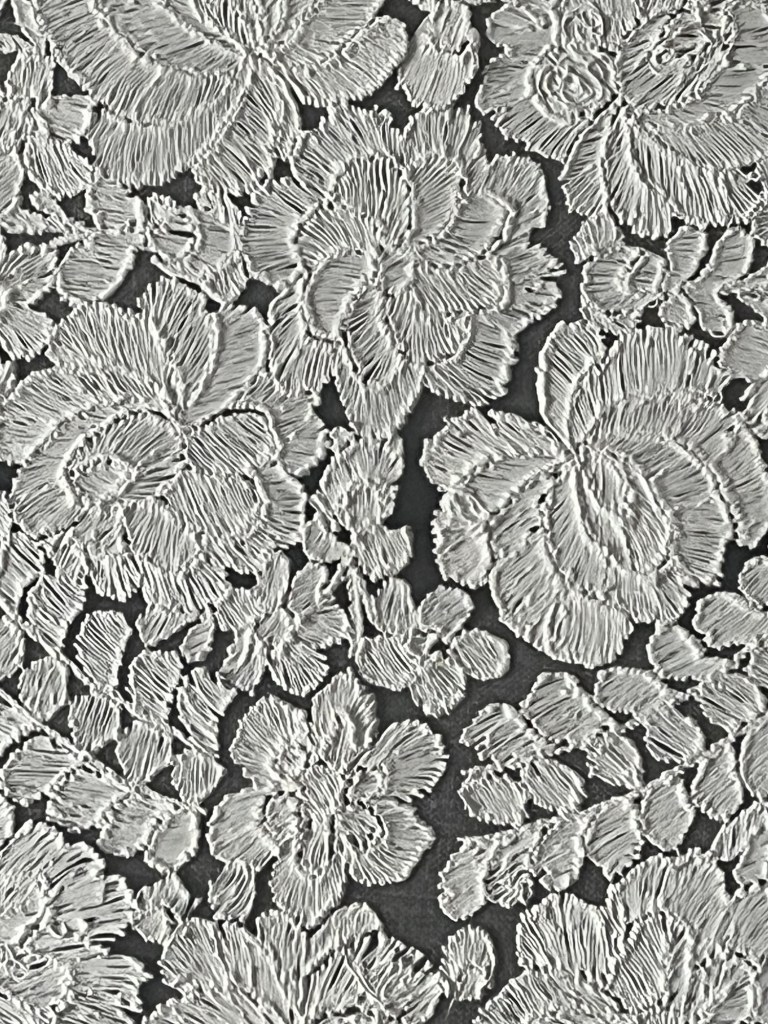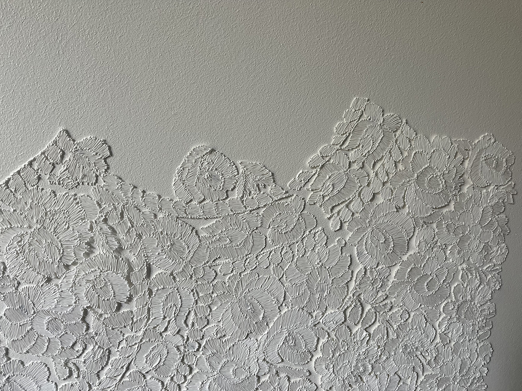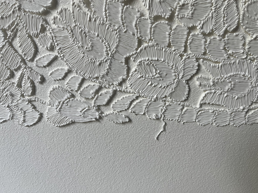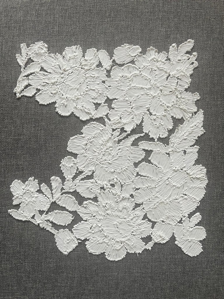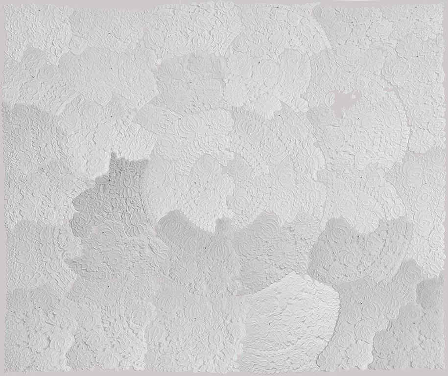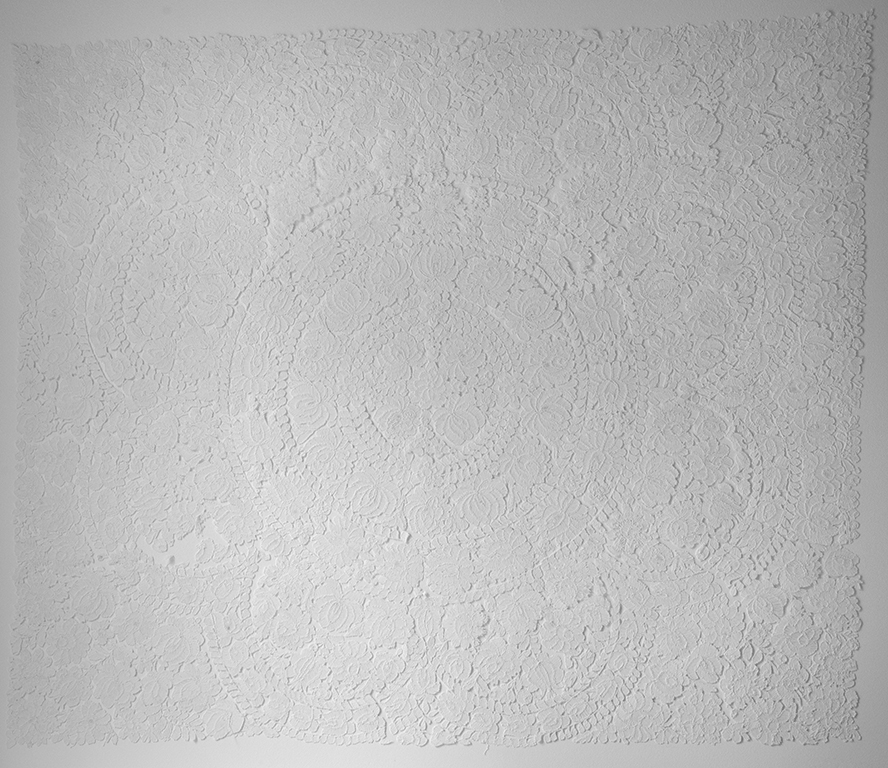 Part 1 – CoercionI a white on white 1:1 drawing of the tablecloth. This one consist of 32 unique pieces that I refer to as Fossils.
