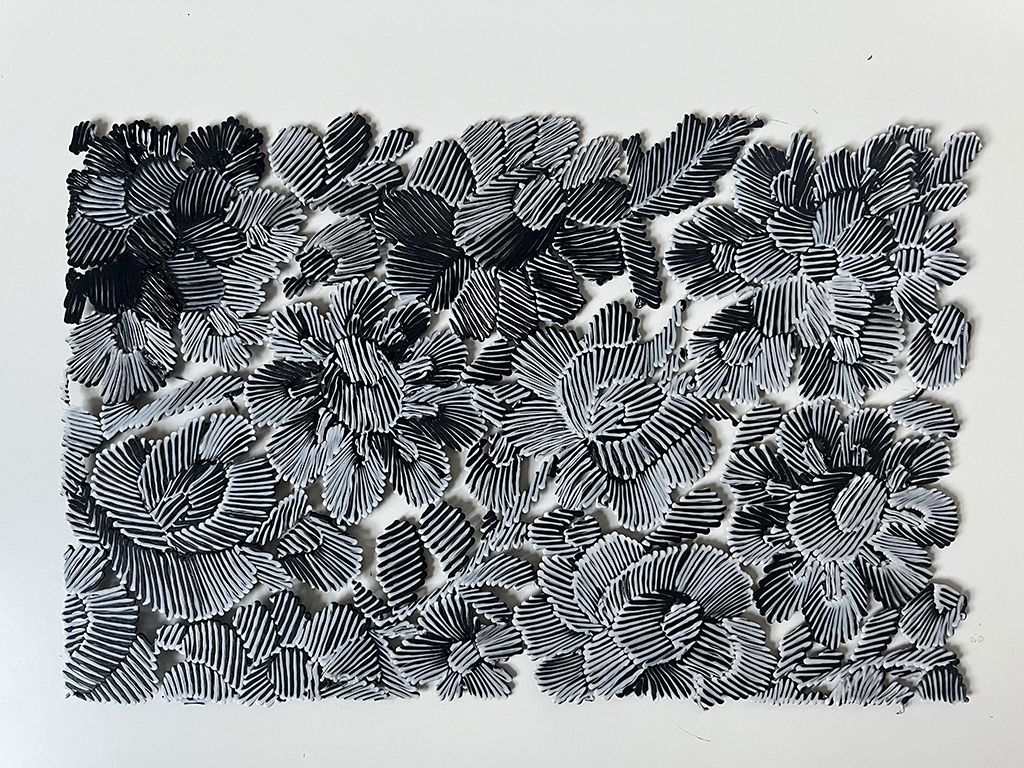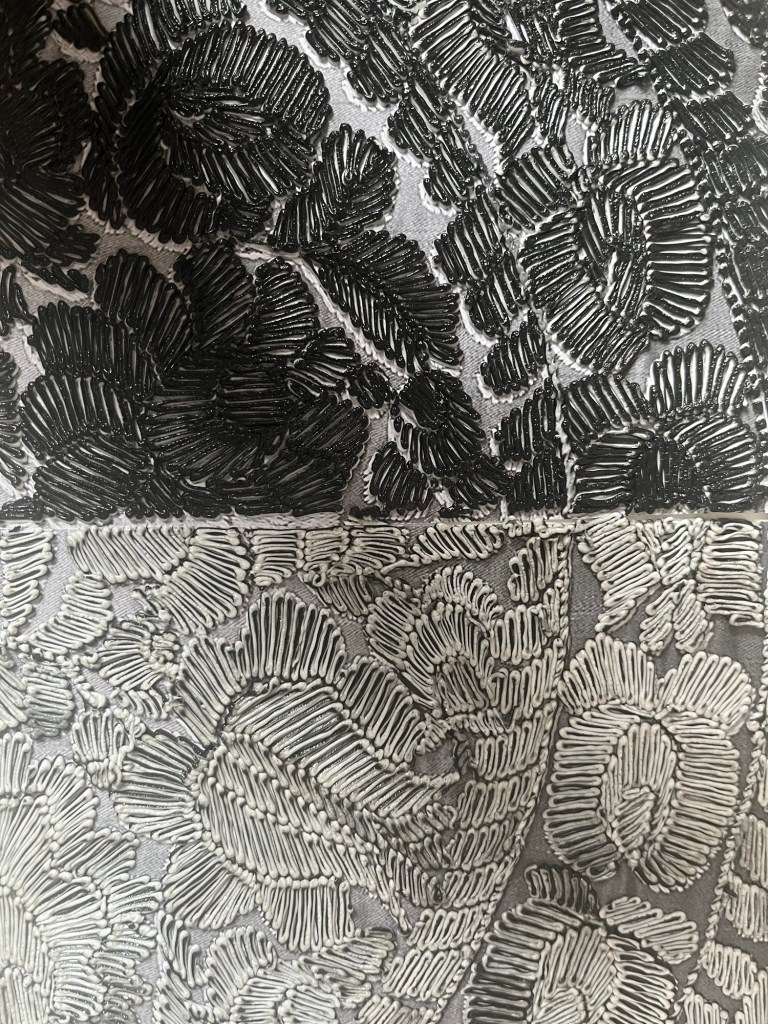 Eventually, I became the problem and was accused of misconduct after I stepped in as a cover to do reception work. The reception was a glass cage with much fresh air – designed to protect me from the outside. One’s proction is other’s surveillance. I was reported for reading a book and whistling. I can’t whistle. I did read Miriam Toews’ Women Talking on the way to work and left it at the table. Ironically, the situation paralelled with the book. The systematic structure, women being caged (with an illusion of choice) and the prohibition of reading. With black and white filament I wanted to show the two sides. This time the overal pattern of the tablecloth was not respecting the motifs (the Fossils do), but arbitrarily cuts right through them (as office rules that wrap professioalism to inhuman practice). To immitate the suffocating glass cage situation, I casted the plates in a thin coat of epoxy, allowing uneven surface and trapped air bubles.